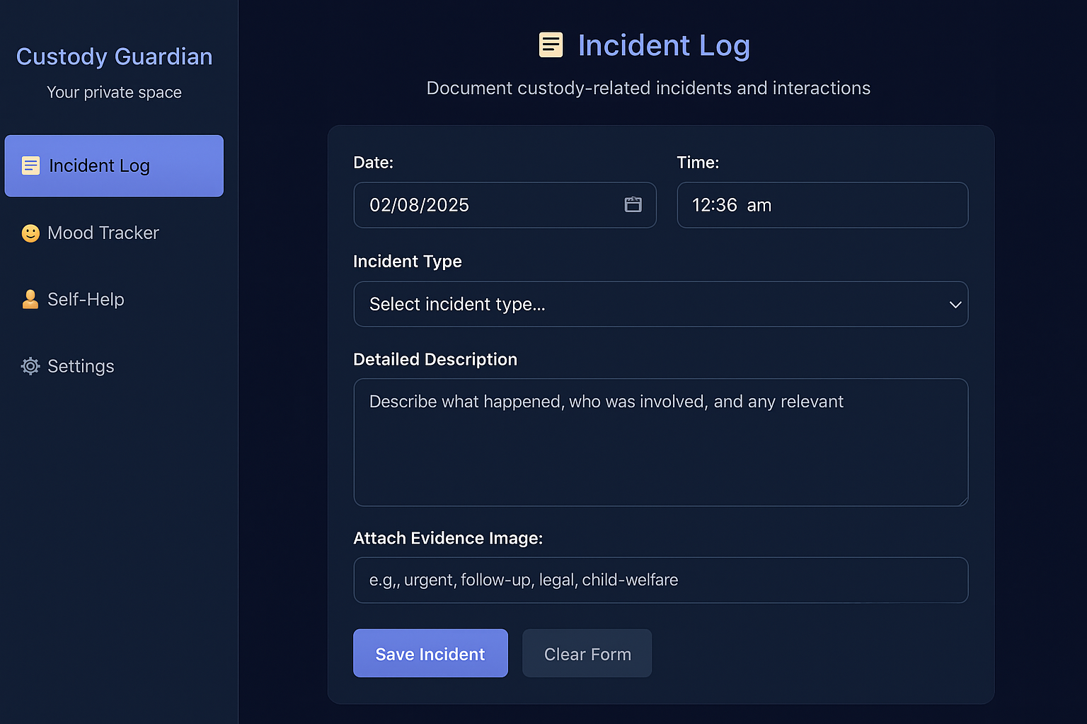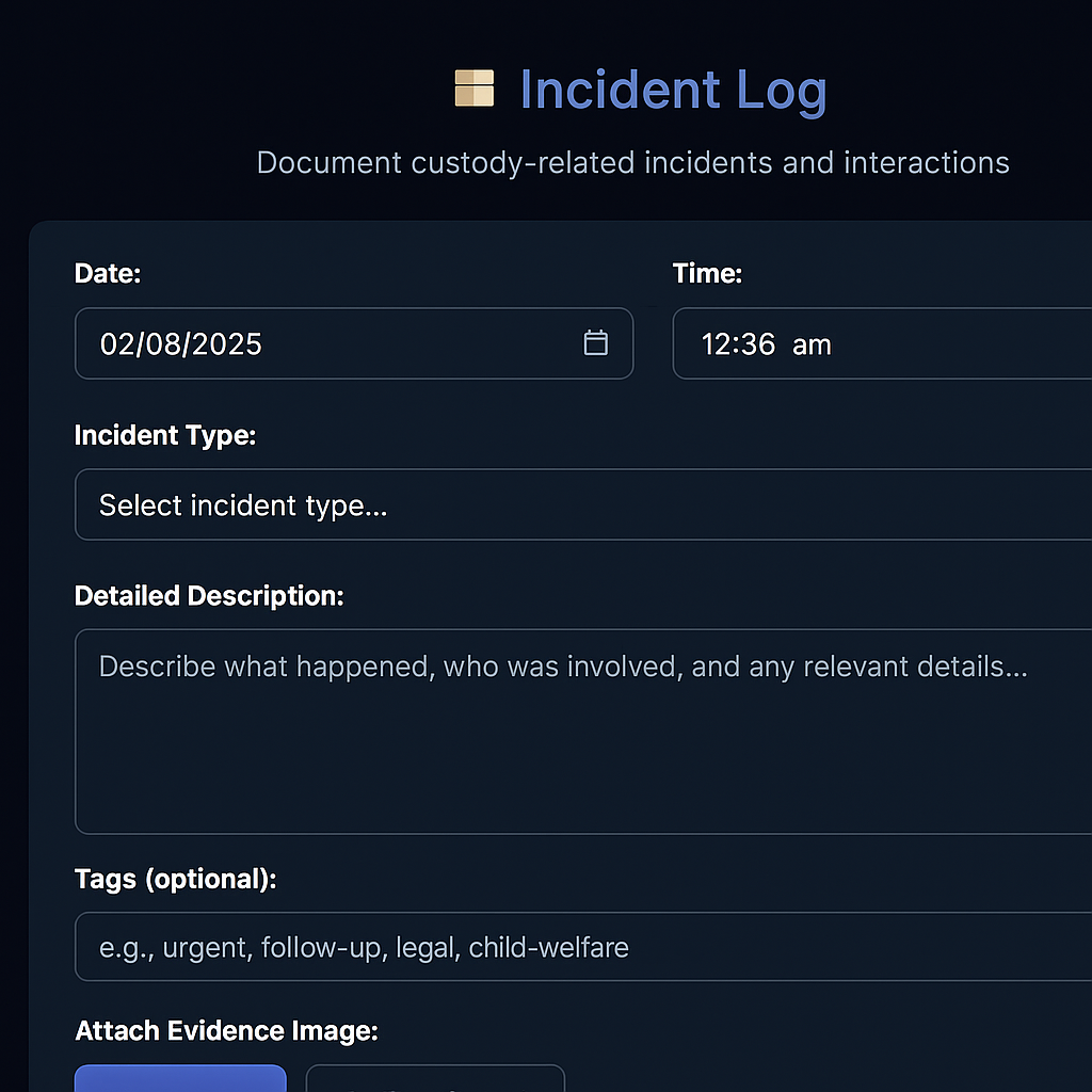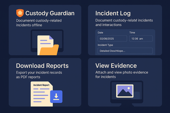 Custody Guardian is a powerful offline tool designed for separated parents, caregivers, and guardians who need to document custody interactions, incidents, pickups, and communication—privately and securely.