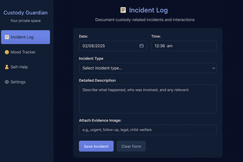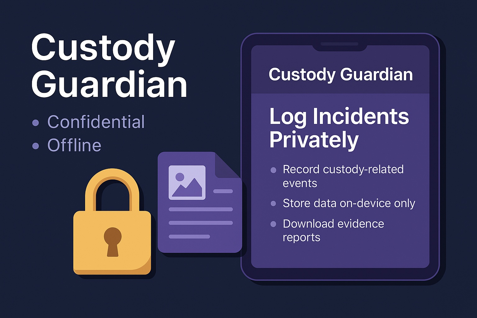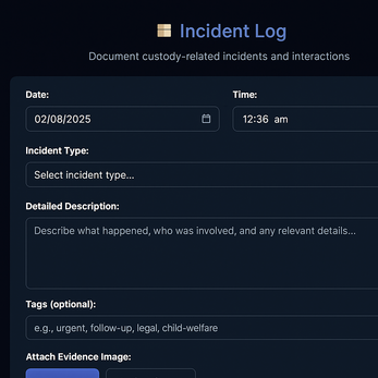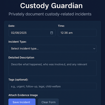 Built for real people navigating real challenges, Custody Guardian makes it simple to track, timestamp, and report every important event — all without the cloud, servers, or accounts. Your data stays 100% local, safe, and under your control.