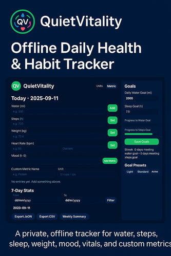 QuietVitality is a privacy-first health log for real life. Track the basics (water, steps, sleep, weight), add vitals (heart rate, blood pressure), record mood, and create your own custom metrics for anything from protein grams to physio reps. Set daily goals, see rolling 7-day insights, filter your history, and export CSV/JSON or print Weekly Summaries—all completely offline.