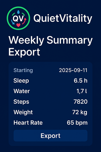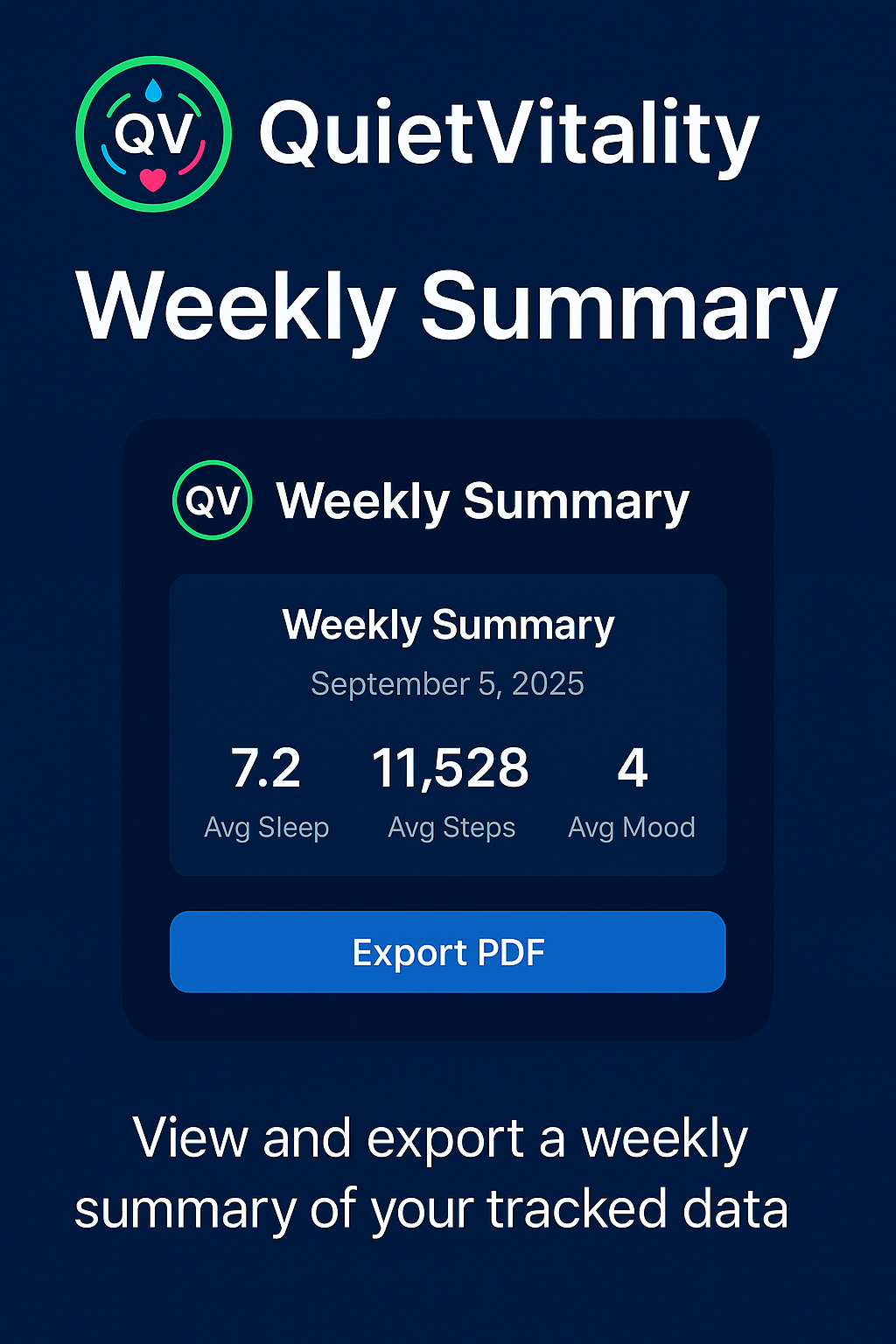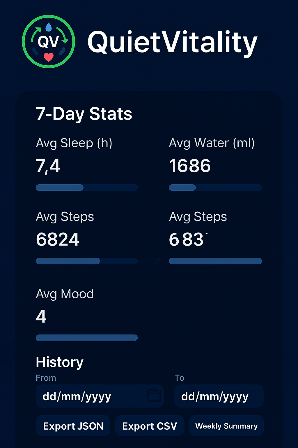QuietVitality is the no-nonsense, offline way to track health and habits—fast, private, and export-friendly. Own your data. Build better routines. Feel in control.